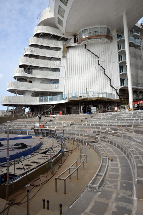 The Symphony of the Seas construction is progressing nicely at the STX Shipyard in France. With eight months left to go until her maiden voyage, the hurried pace of construction is evident all over the ship.