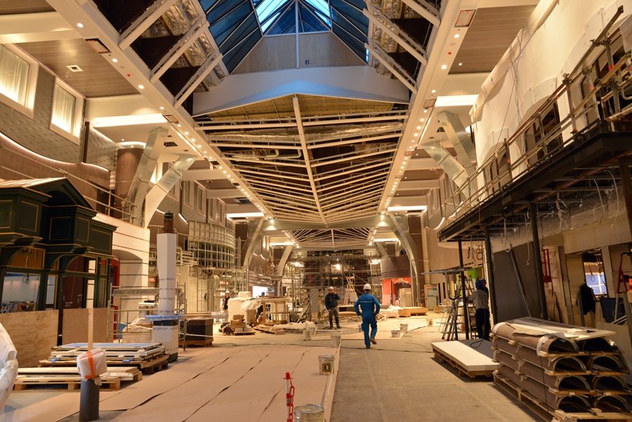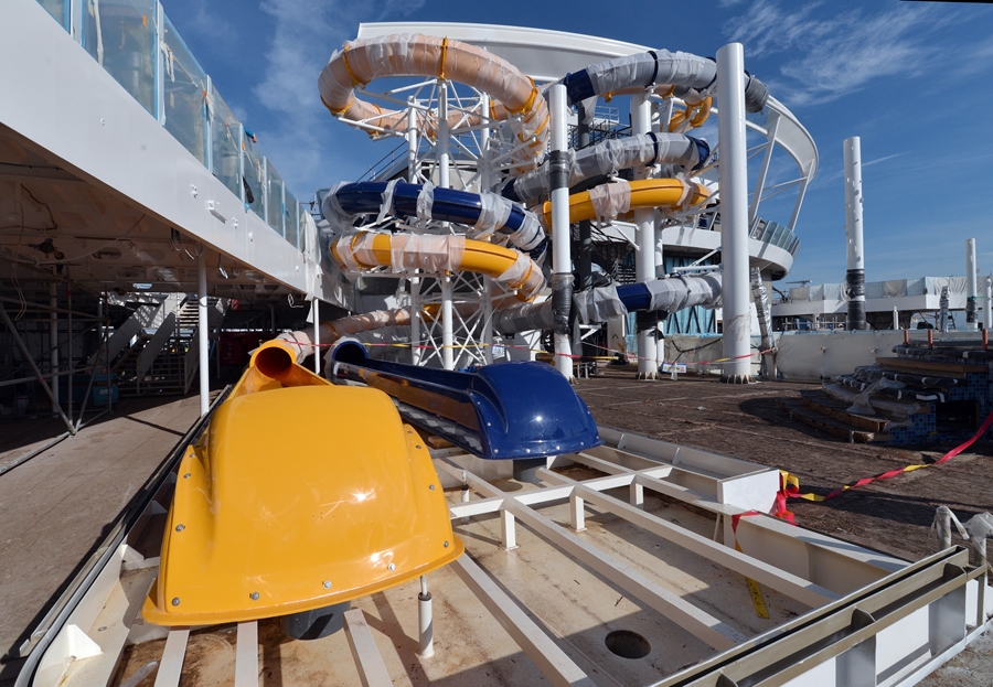 Symphony of the Seas October Construction Photos from the STX Shipyard in France show a lot of progress from last month. Highlights of the progress are the installation of the Ultimate Abyss slide, the perfect storm water slides and rock walls, plus a lot of finishing details in Central Park and Royal Promenade areas.