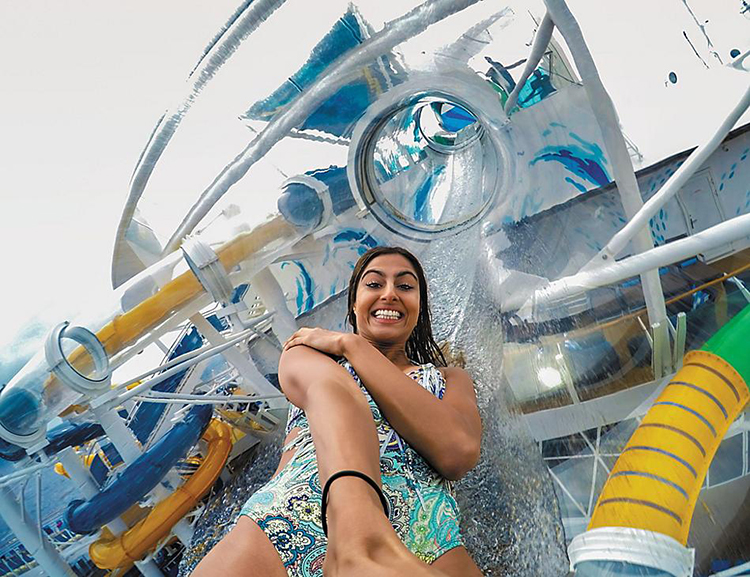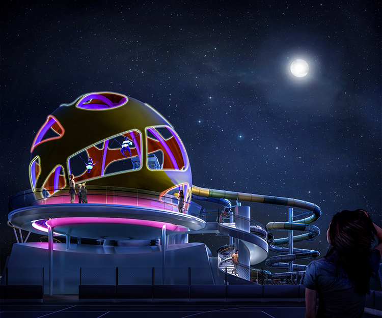 “Three stories high with wet and wild thrills, The Perfect Storm℠ water slide duo takes excitement off the charts. Grab a buddy and race through twists, turns and translucent panels offering unforgettable views, to the bottom of the Typhoon and Cyclone slides.”