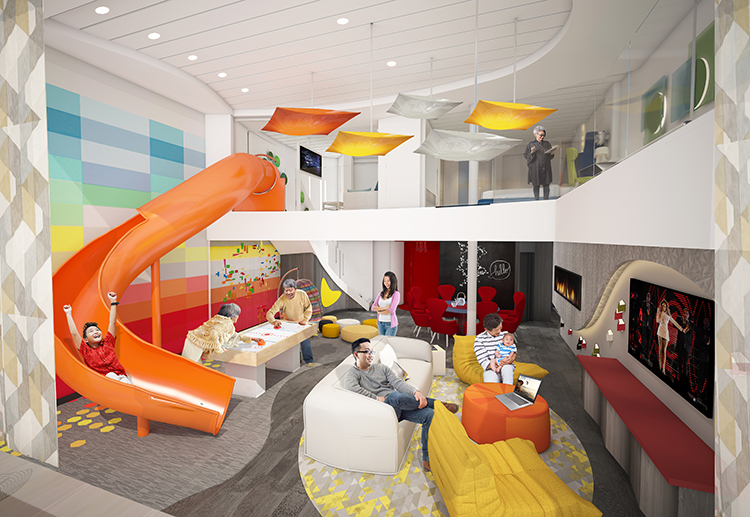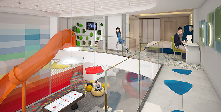For families that want to experience more quality time together, Spectrum of the Seas will introduce the two-level, 2,809-square-foot Ultimate Family Suite, accommodating up to 11 guests. The three-bedroom suite, which will include a master bedroom with a bathroom that extends over the side of the ship to provide unparalleled ocean views, along with two additional suites for grandparents and other family members. Kids have their own kid-friendly space on the upper level, complete with an in-suite slide that will transport them to the living area below. Everyone in the family can enjoy time together in the recreation room, featuring surround-sound equipment for a night of karaoke, movies or video games.