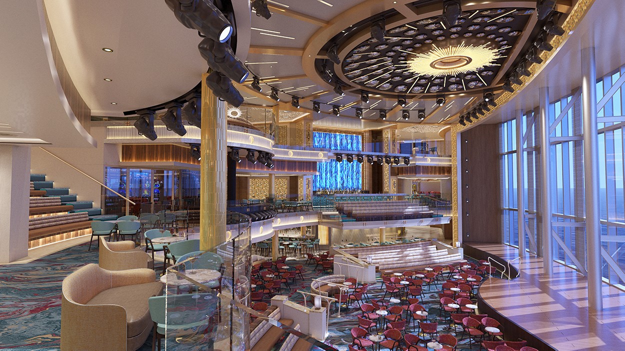 Grand Central – Grand Central takes the traditional atrium concept to new heights, combining a day-to-night entertainment complex with spectacular three-deck-high floor-to-ceiling windows and a bar overlooking the starboard side of the ship that will be the perfect venue for socializing and people watching amid sweeping ocean vistas.