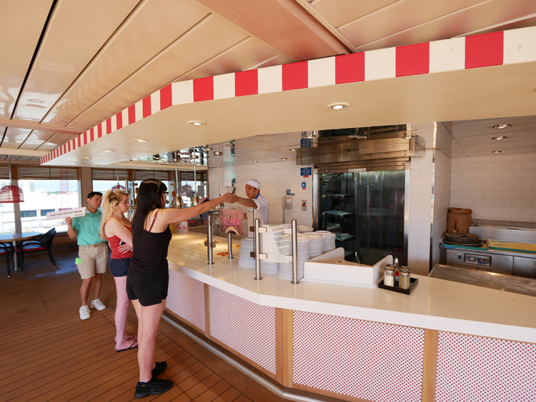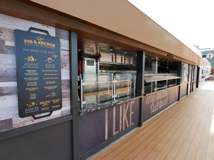 Carnival is known for having the most included dining options onboard their ships and the Sunrise does not disappoint. Even the most picky eaters will find something to enjoy from the daily menu selections in the main dining room and expansive lido marketplace buffet including The Deli and new addition Lucky Bowl, where you can get made-to-order bowls. Unfortunately, while the food is delicious, Carnival replaced one of my favorites spots, Mongolian Wok with this new offering. Other popular complimentary venues include Guy’s Burger Joint, with some of the best burgers at sea, BlueIguana Cantina, serving great burritos, huevos rancheros and arepas during breakfast and burritos and tacos for lunch, plus an awesome salsa bar, Pizzeria del Capitano with five varieties of pizza by the slice (or get a whole pizza delivered anywhere onboard for $5), and Pasta Bella Pasta Bar (located inside Cucina del Capitano), for made to order pasta dishes during lunch. Also not to miss is Guy’s Pig & Anchor Smokehouse, dishing up platefuls of down-home barbecue faves like pulled pork, bbq chicken, beef brisket and sides like baked beans, collard greens and mac and cheese. Take the time to enjoy a leisurely meal with offerings like steak and eggs, eggs benedict, burgers, pasta and many others at the SeaDay Brunch, served in the aft Sunshine Restaurant on sea days only of course.