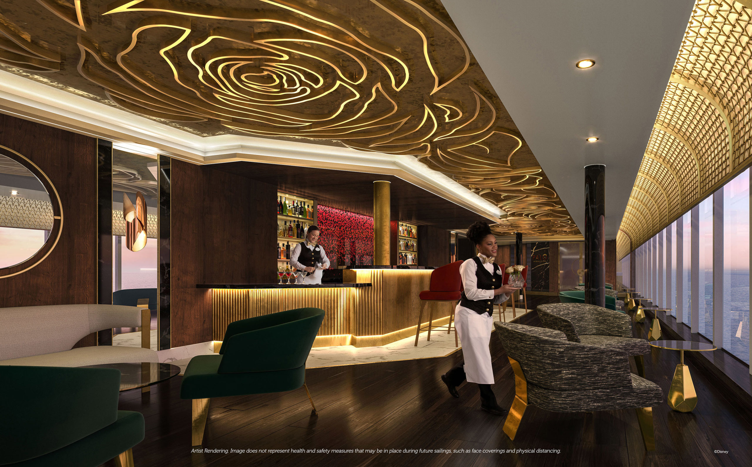 For the first time on a Disney ship, guests will embark on a space-jumping tour of the Star Wars galaxy at Star Wars: Hyperspace Lounge, a high-end bar styled as a luxurious yacht-class spaceship. This richly themed, immersive experience will be reserved for adults every evening, offering interactive tasting experiences and signature beverages inspired by the films.